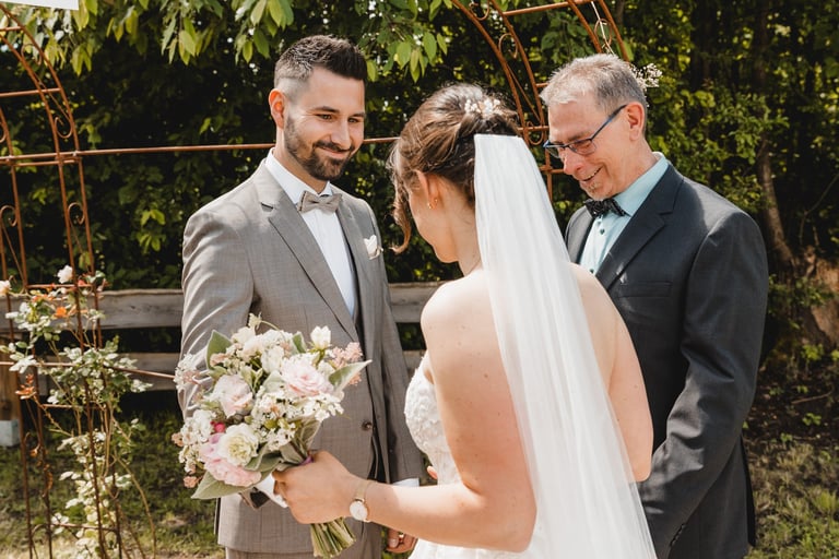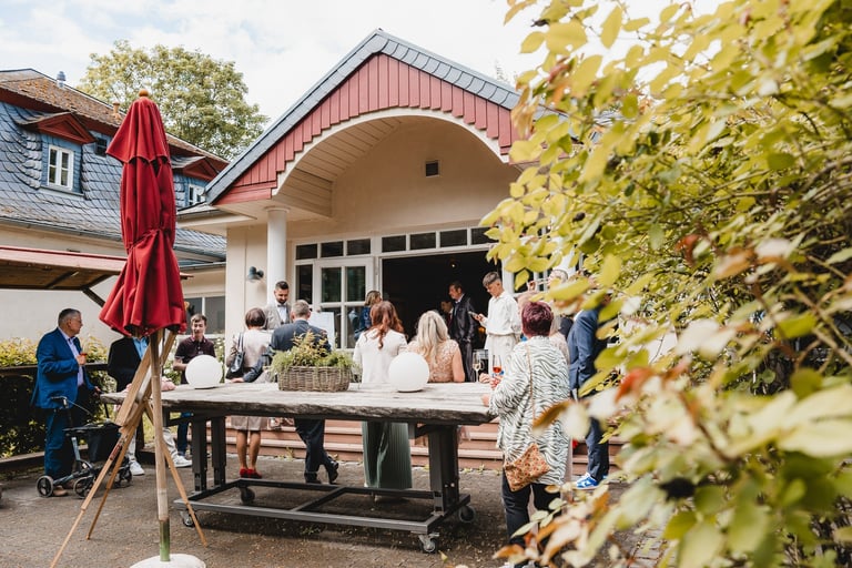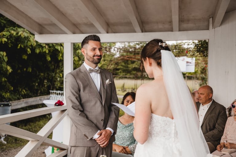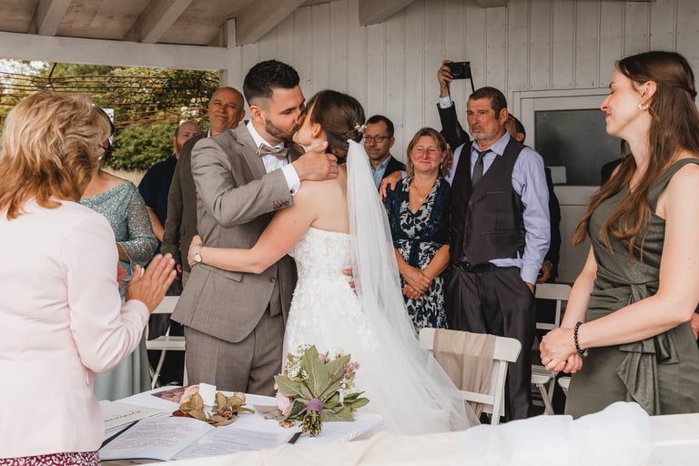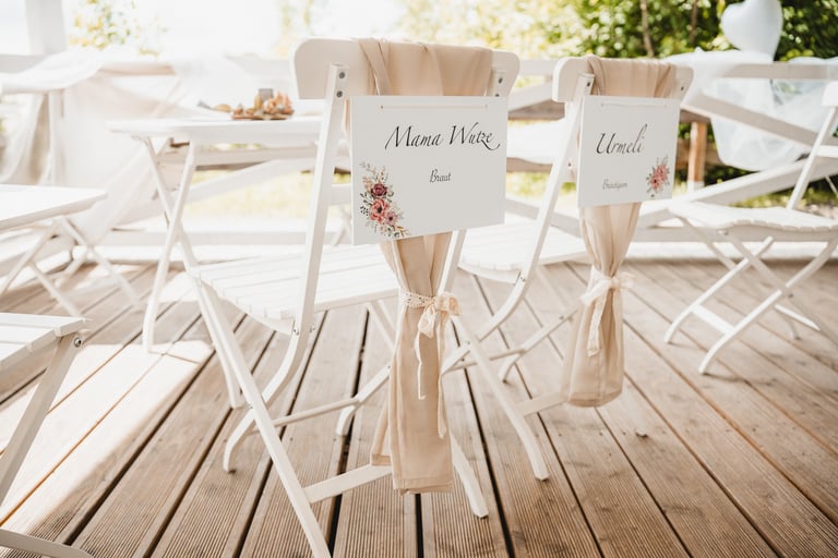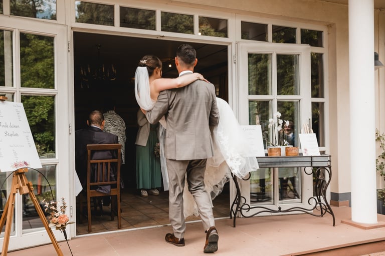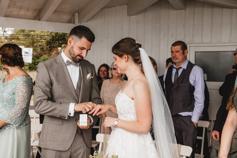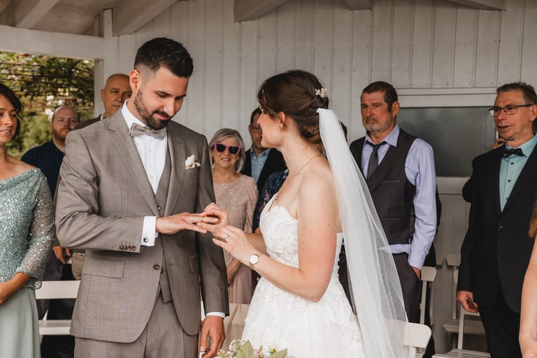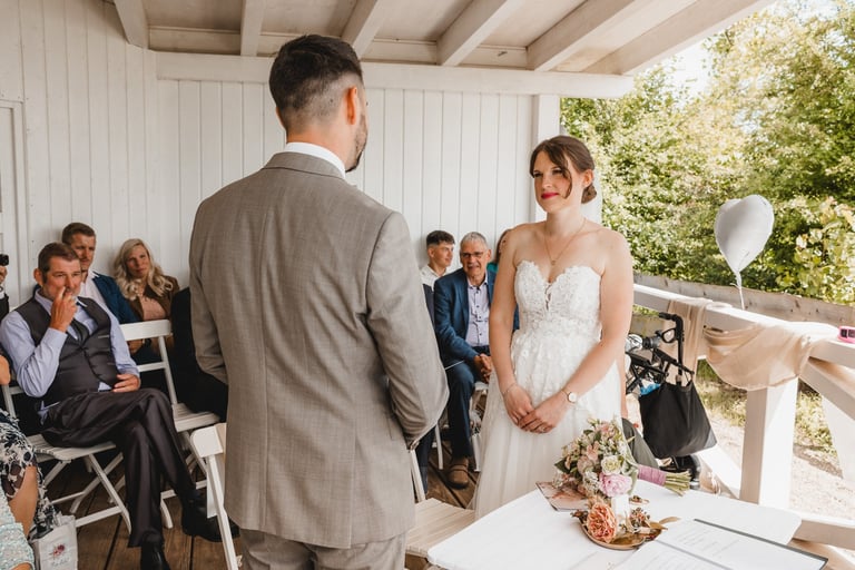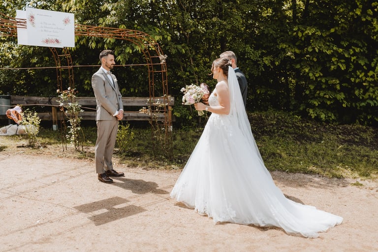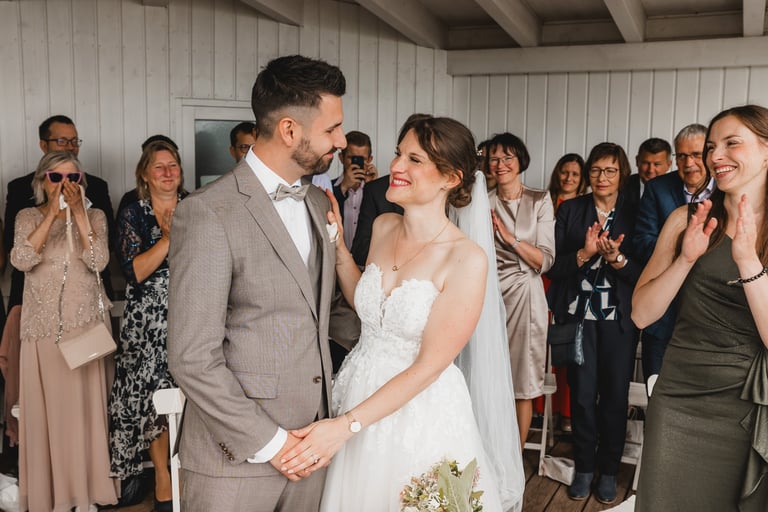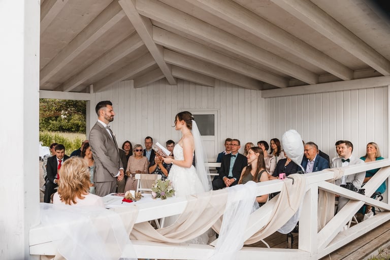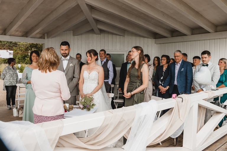 Am Wölfersheimer See, inmitten der idyllischen Wetterauer Natur, gaben sich Lena und Flo das Ja-Wort. Seit 2018 bietet dieser Ort eine ganz besondere Möglichkeit, den Bund fürs Leben zu schließen – direkt am Seeufer, umgeben von einer malerischen Landschaft. Mit viel Liebe und Hingabe haben die beiden das gesamte Gelände für ihre Trauung geschmückt. Die persönliche Note der Dekoration trug zur einzigartigen Atmosphäre bei und verlieh der Hochzeit eine ganz besondere Magie. Während der Zeremonie trugen sie sich ihre eigenen, berührenden Worte vor – ein emotionaler Moment, bei dem kein Auge trocken blieb. Beim anschließenden Sektempfang mit Fingerfood genossen die Gäste die herzliche Stimmung und die wunderschöne Umgebung. Die Feier ging im Anschluss weiter ins Brunnenwärterhaus nach Bad Nauheim – eine einzigartige Location, die mit ihrem charmanten Ambiente und erstklassigem Service zu einer unvergesslichen Feier einlud. Das Brunnenwärterhaus ist bekannt für seine besondere Atmosphäre und bietet Platz für stilvolle Hochzeitsfeiern mit einer fantastischen Auswahl an kulinarischen Köstlichkeiten.