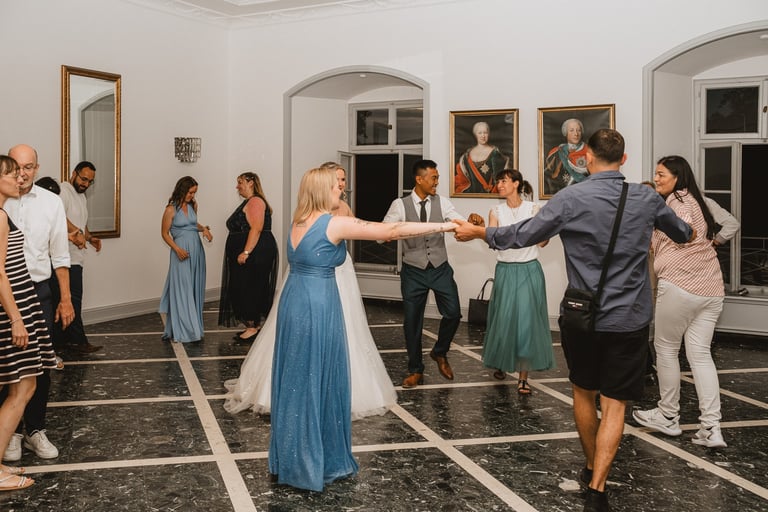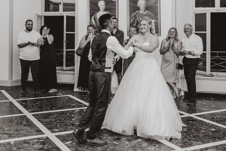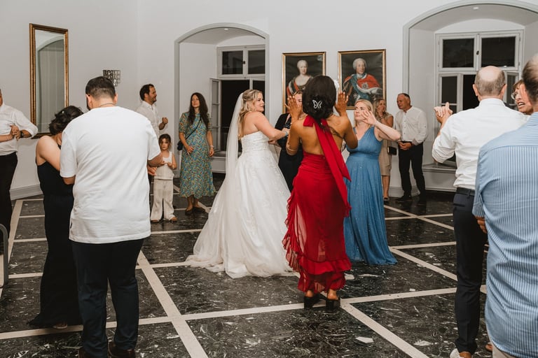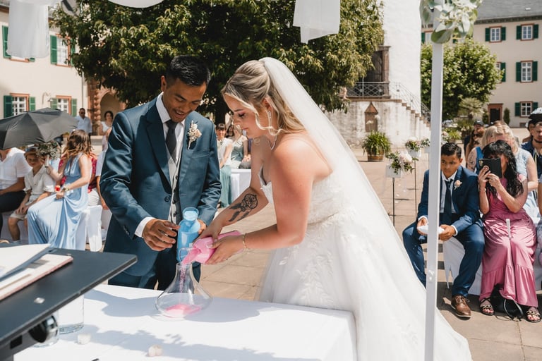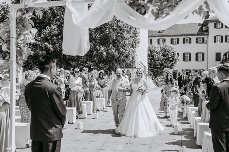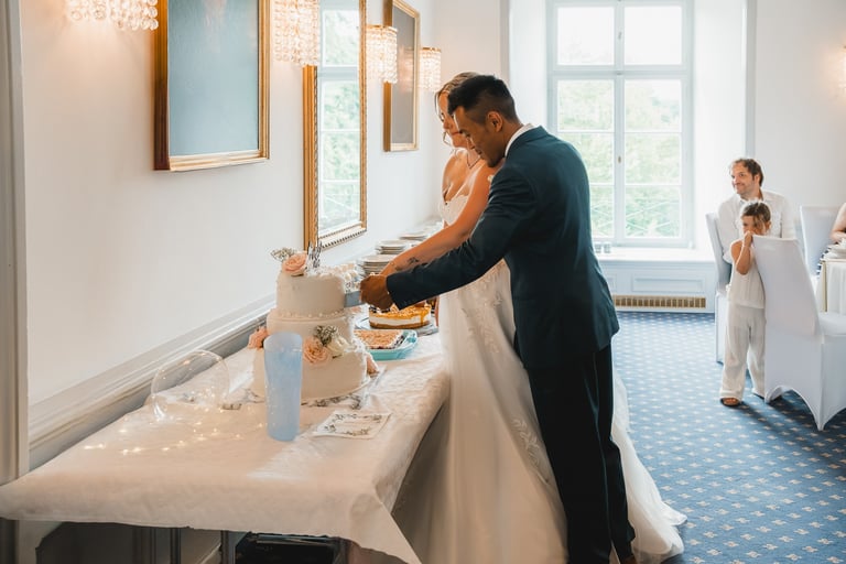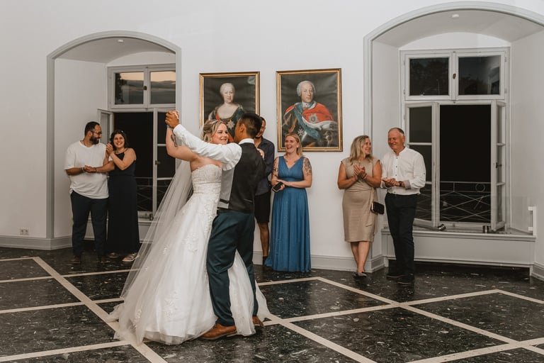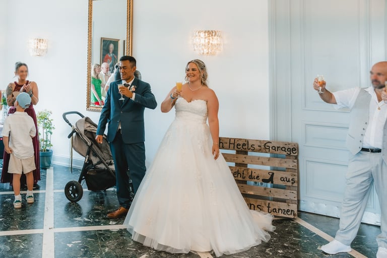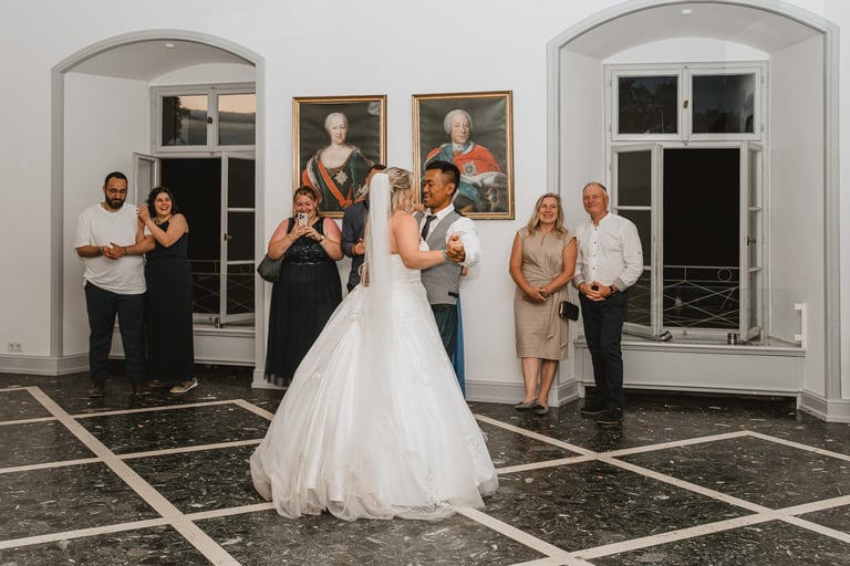 Für ihre Feier haben die beiden den eleganten Weißen Saal und für die freie Trauung die wunderschöne Schlossterrasse gewählt. Alles war bis ins kleinste Detail liebevoll geplant und dekoriert – man spürte in jedem Moment, wie viel Herzblut Yvonne und Yutthana in diesen besonderen Tag gesteckt haben.