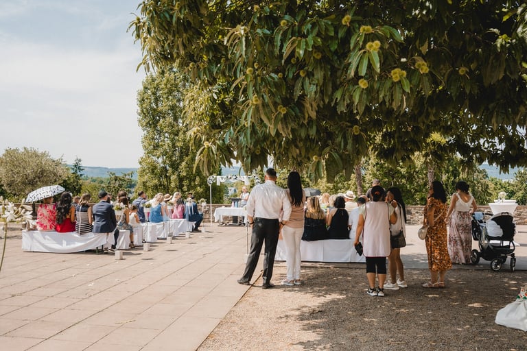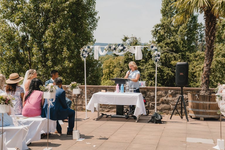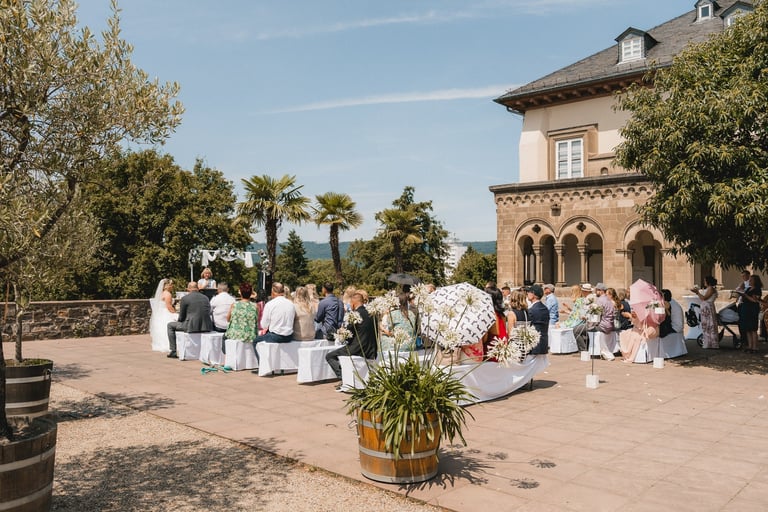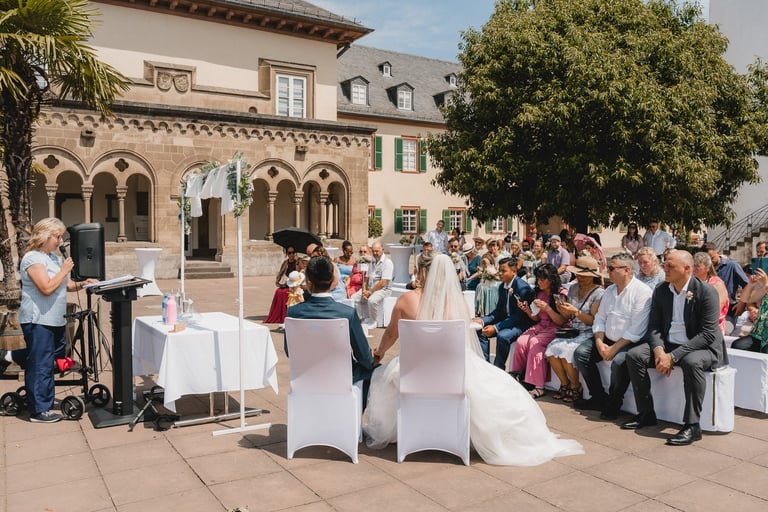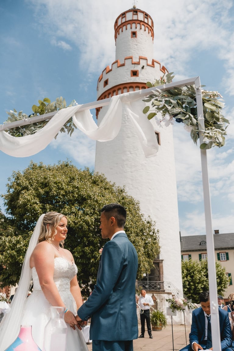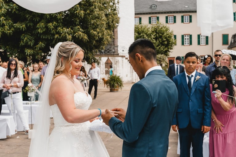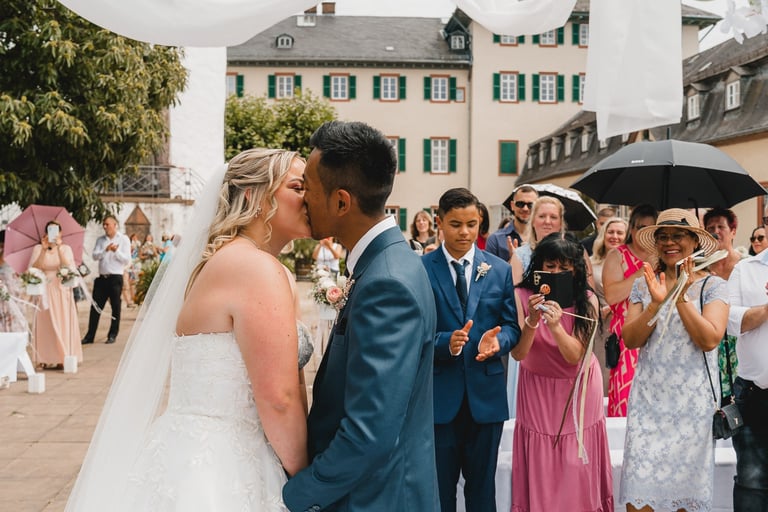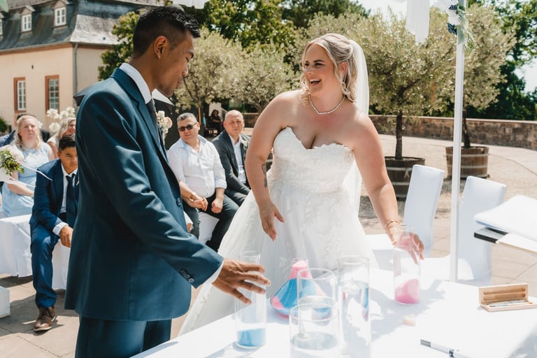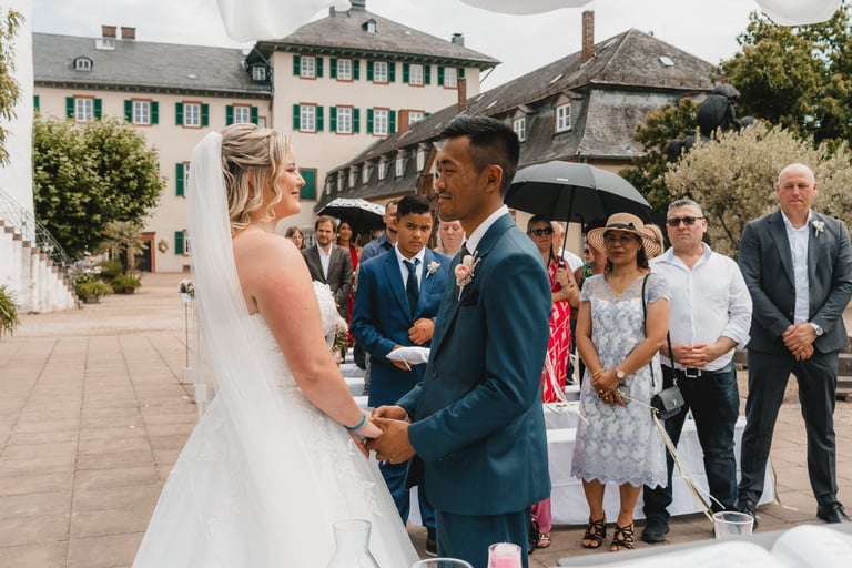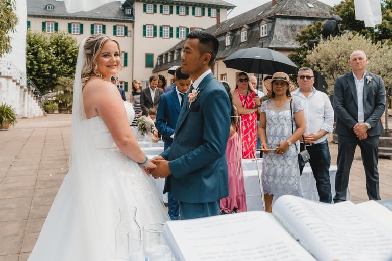Es war ein rundum wunderschöner Tag – von der emotionalen Trauung auf der Terrasse mit Blick über den Taunus und den Schlosspark bis hin zum typisch thailändischen Abendbuffet, das nicht nur für die Gäste, sondern auch für uns ein absolutes Highlight war.