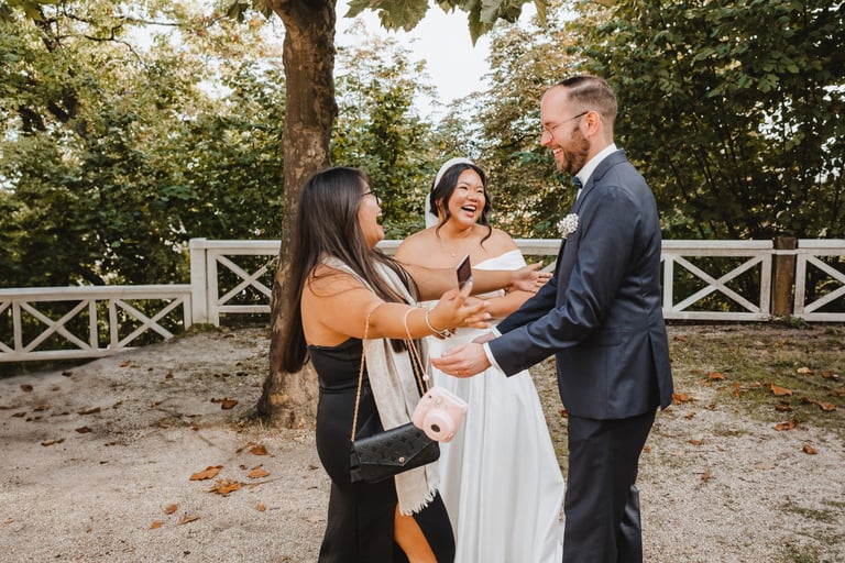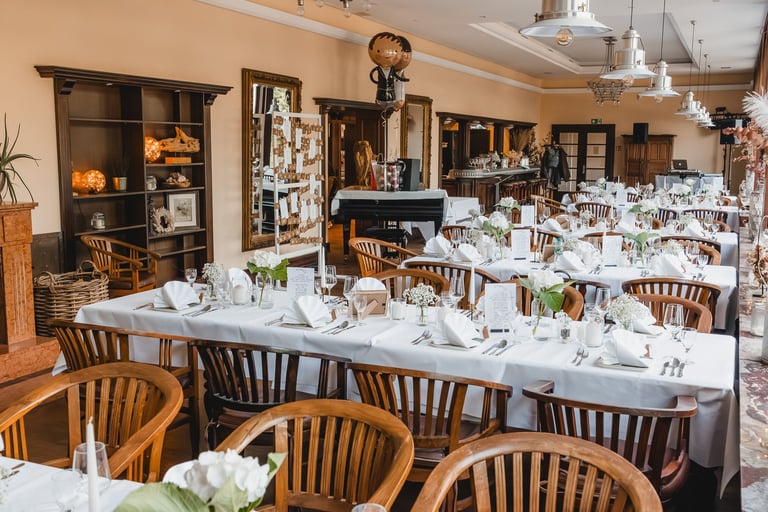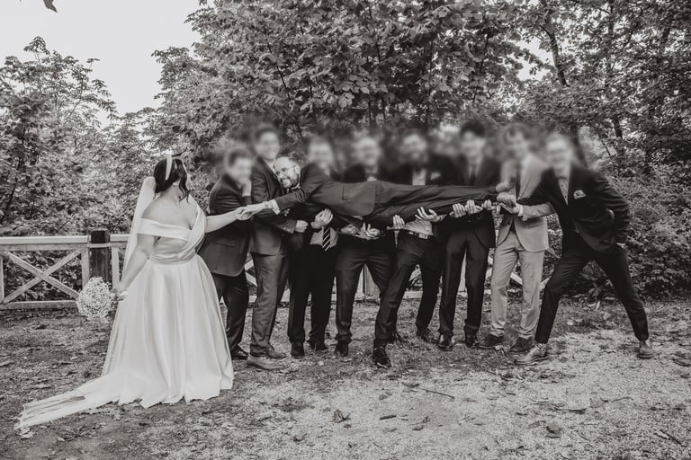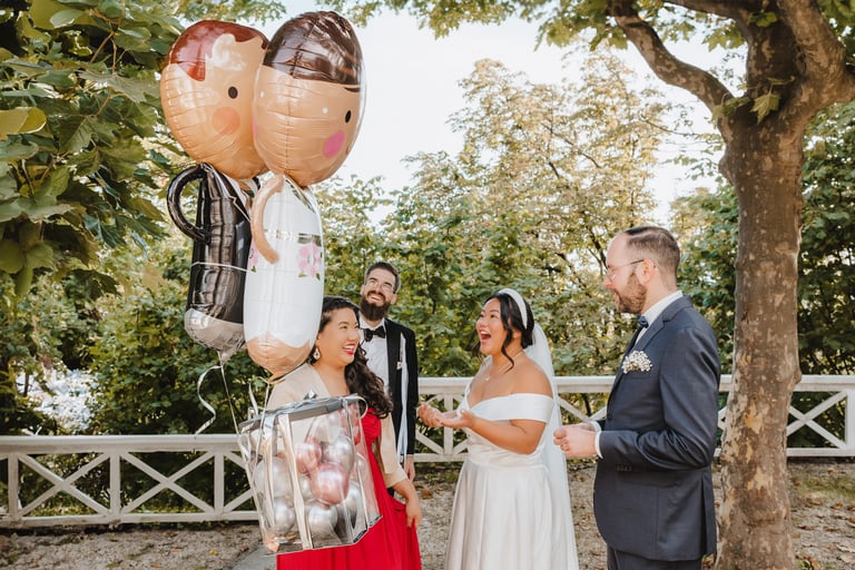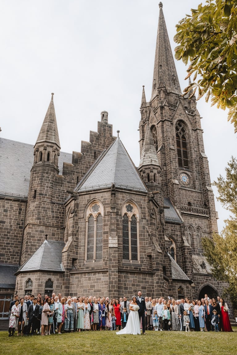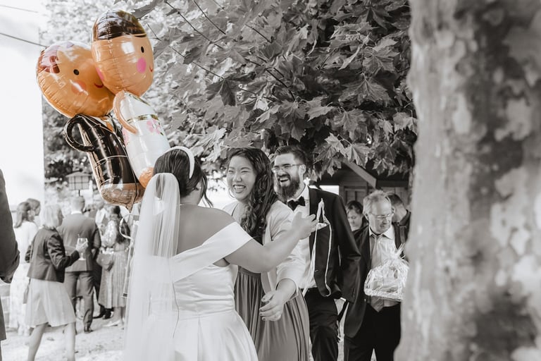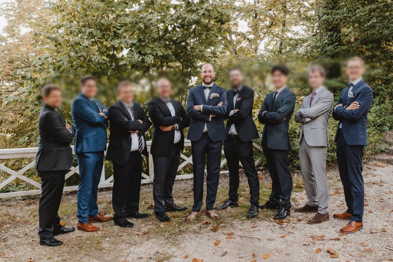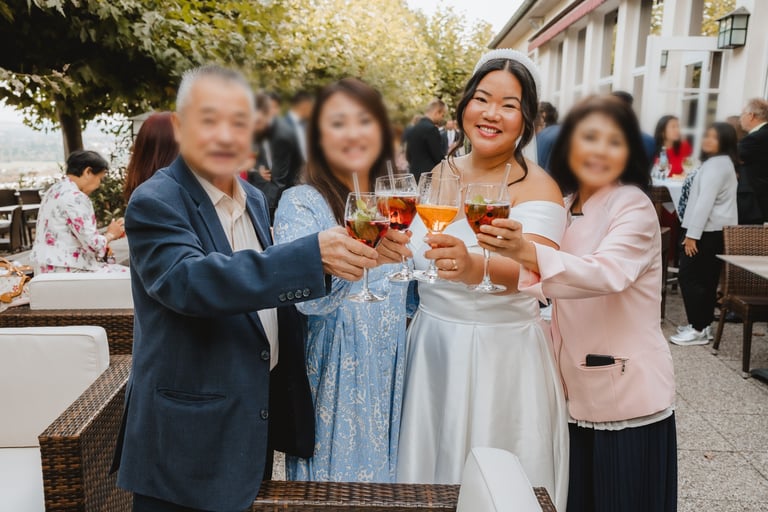 Nach der Trauung ging es für die Hochzeitsgesellschaft weiter auf den Johannisberg in Bad Nauheim, wo im Restaurant Johannisberg die Feierlichkeiten mit einem atemberaubenden Blick auf die Stadt begannen. Bei Gruppenfotos mit den Gästen, köstlichem Essen und ausgelassener Stimmung wurde der Tag gebührend gefeiert. Der Johannisberg bietet nicht nur eine spektakuläre Aussicht, sondern auch die perfekte Location für eine stilvolle Hochzeitsfeier.