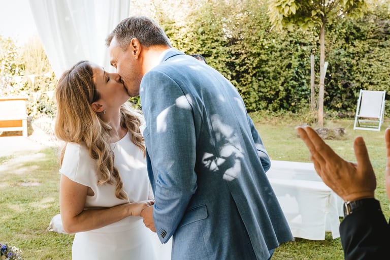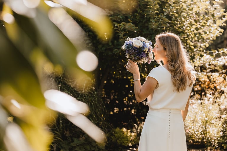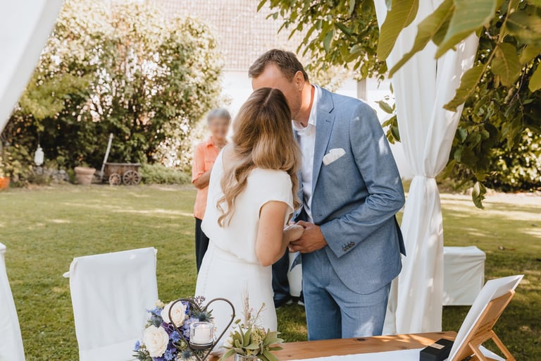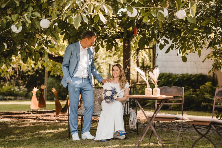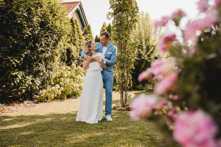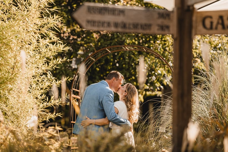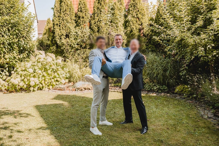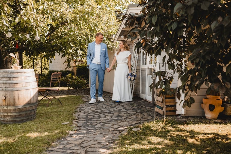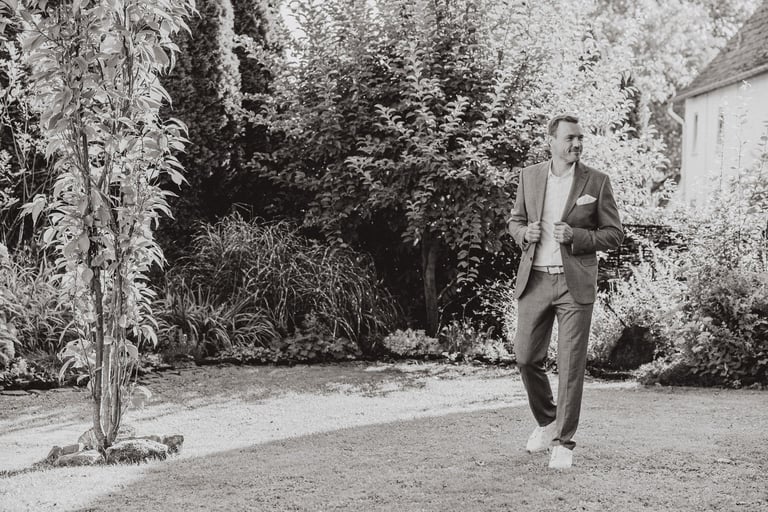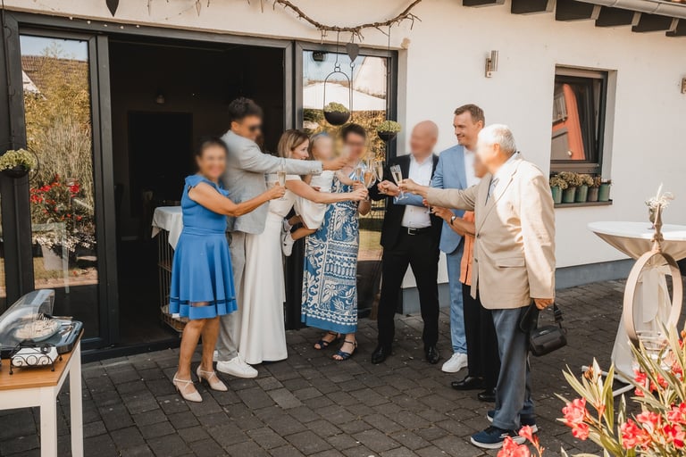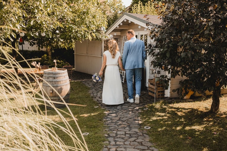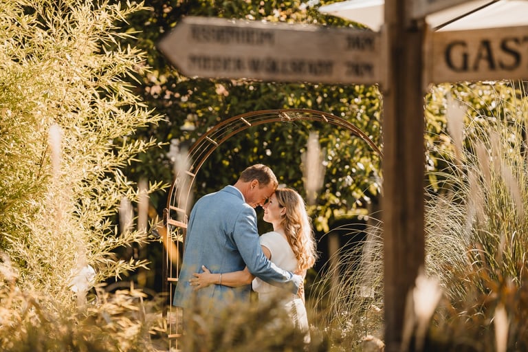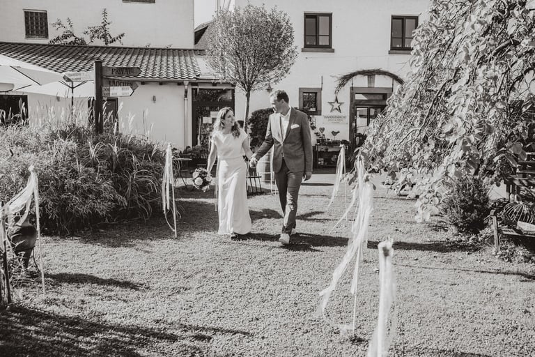 An einem traumhaft schönen Sommermorgen begann der große Tag von Katrin und Thomas auf dem idyllischen Heimburghof in Bönstadt (Assenheim). Bereits beim ersten Blick auf das Anwesen war klar: Dieser Tag sollte genauso einzigartig werden wie das Paar selbst. Das Brautpaarshooting fand im sanften, goldenen Morgenlicht statt, das den gesamten Hof in eine zauberhafte Atmosphäre tauchte. Dieses weiche Licht verlieh den Bildern eine besonders warme, romantische Stimmung, die die Emotionen des Paares perfekt unterstrich. Der liebevoll gepflegte Heimburghof bot uns als Fotografen zahlreiche wunderbare Möglichkeiten, das Brautpaar in Szene zu setzen. Ob unter den riesigen, alten Bäumen, vor den üppig blühenden Büschen und Pflanzen oder an den rustikalen Gebäuden und Toren des Hofes. Nach dem Shooting ging es zu einem der emotionalsten Momente des Tages: der Trauung. Unter dem offenen Himmel, umgeben von der Natur und den warmen Sonnenstrahlen, gaben sich Katrin und Thomas ihr Ja-Wort. Im Anschluss an die Trauung wurde auf dem Heimburghof angestoßen. Bei leckeren Snacks und anregenden Gesprächen ließen sich Katrin und Thomas von ihren Gästen feiern und genossen die ersten Momente als frisch verheiratetes Paar.