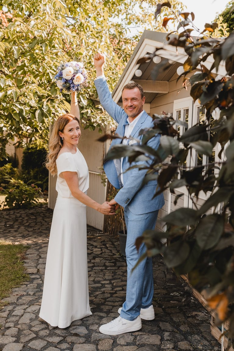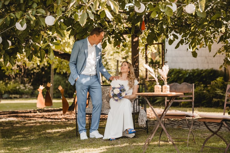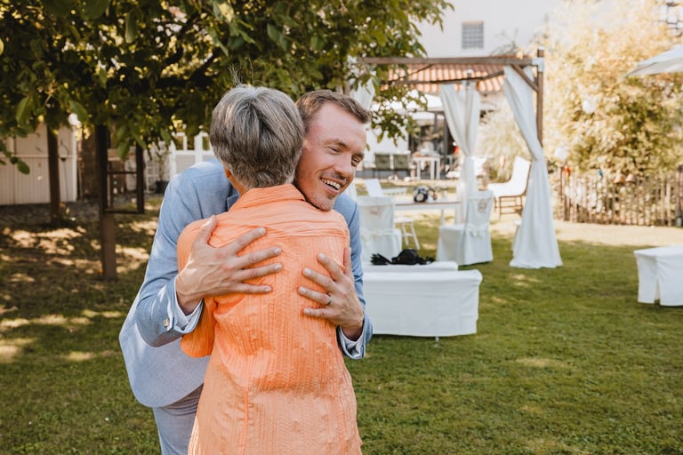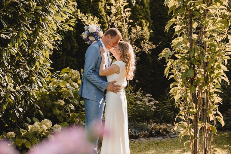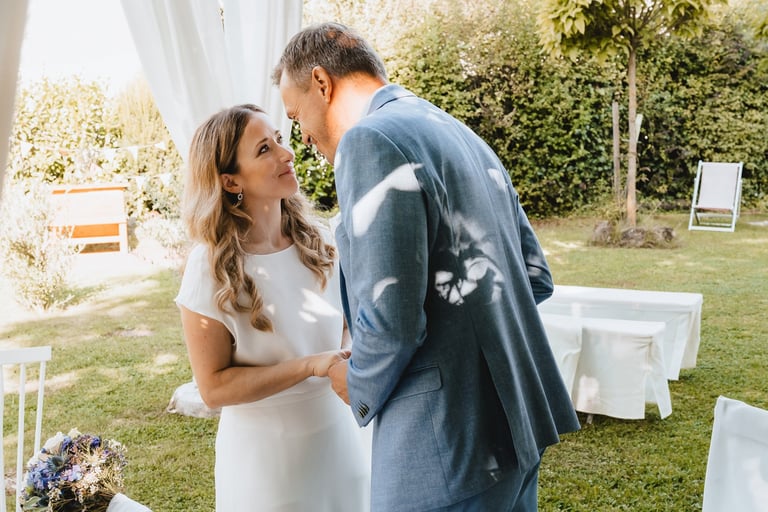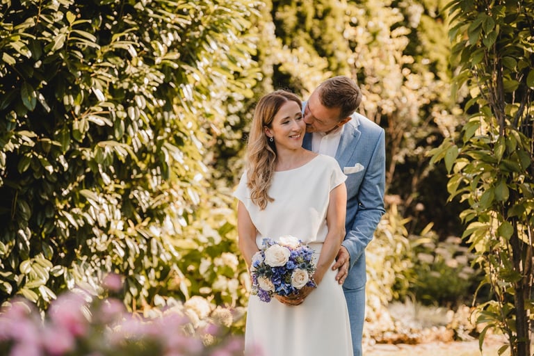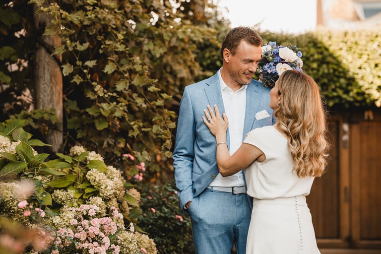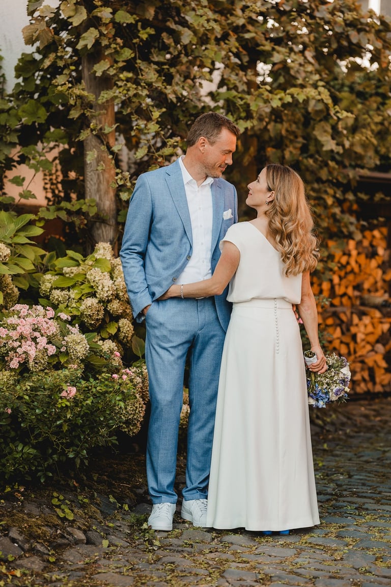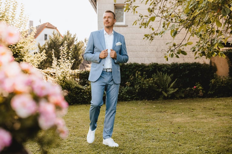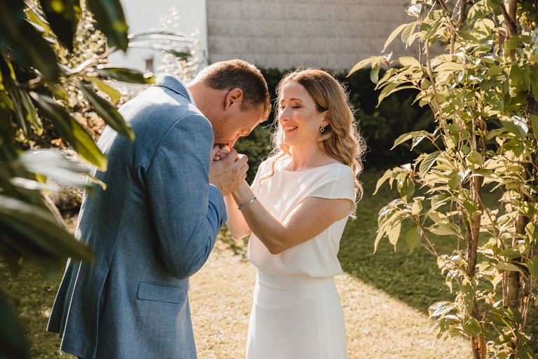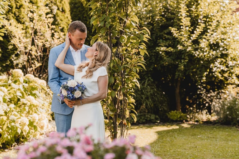 An einem traumhaft schönen Sommermorgen begann der große Tag von Katrin und Thomas auf dem idyllischen Heimburghof in Bönstadt (Assenheim). Bereits beim ersten Blick auf das Anwesen war klar: Dieser Tag sollte genauso einzigartig werden wie das Paar selbst. Das Brautpaarshooting fand im sanften, goldenen Morgenlicht statt, das den gesamten Hof in eine zauberhafte Atmosphäre tauchte. Dieses weiche Licht verlieh den Bildern eine besonders warme, romantische Stimmung, die die Emotionen des Paares perfekt unterstrich. Der liebevoll gepflegte Heimburghof bot uns als Fotografen zahlreiche wunderbare Möglichkeiten, das Brautpaar in Szene zu setzen. Ob unter den riesigen, alten Bäumen, vor den üppig blühenden Büschen und Pflanzen oder an den rustikalen Gebäuden und Toren des Hofes. Nach dem Shooting ging es zu einem der emotionalsten Momente des Tages: der Trauung. Unter dem offenen Himmel, umgeben von der Natur und den warmen Sonnenstrahlen, gaben sich Katrin und Thomas ihr Ja-Wort. Im Anschluss an die Trauung wurde auf dem Heimburghof angestoßen. Bei leckeren Snacks und anregenden Gesprächen ließen sich Katrin und Thomas von ihren Gästen feiern und genossen die ersten Momente als frisch verheiratetes Paar.